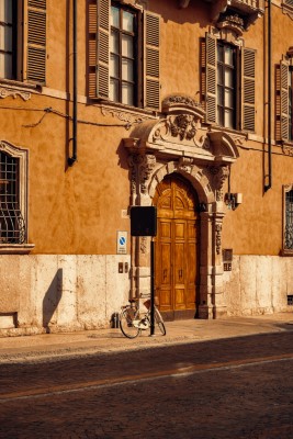 zückt einen Schlüssel und schließt die Eingangstür auf