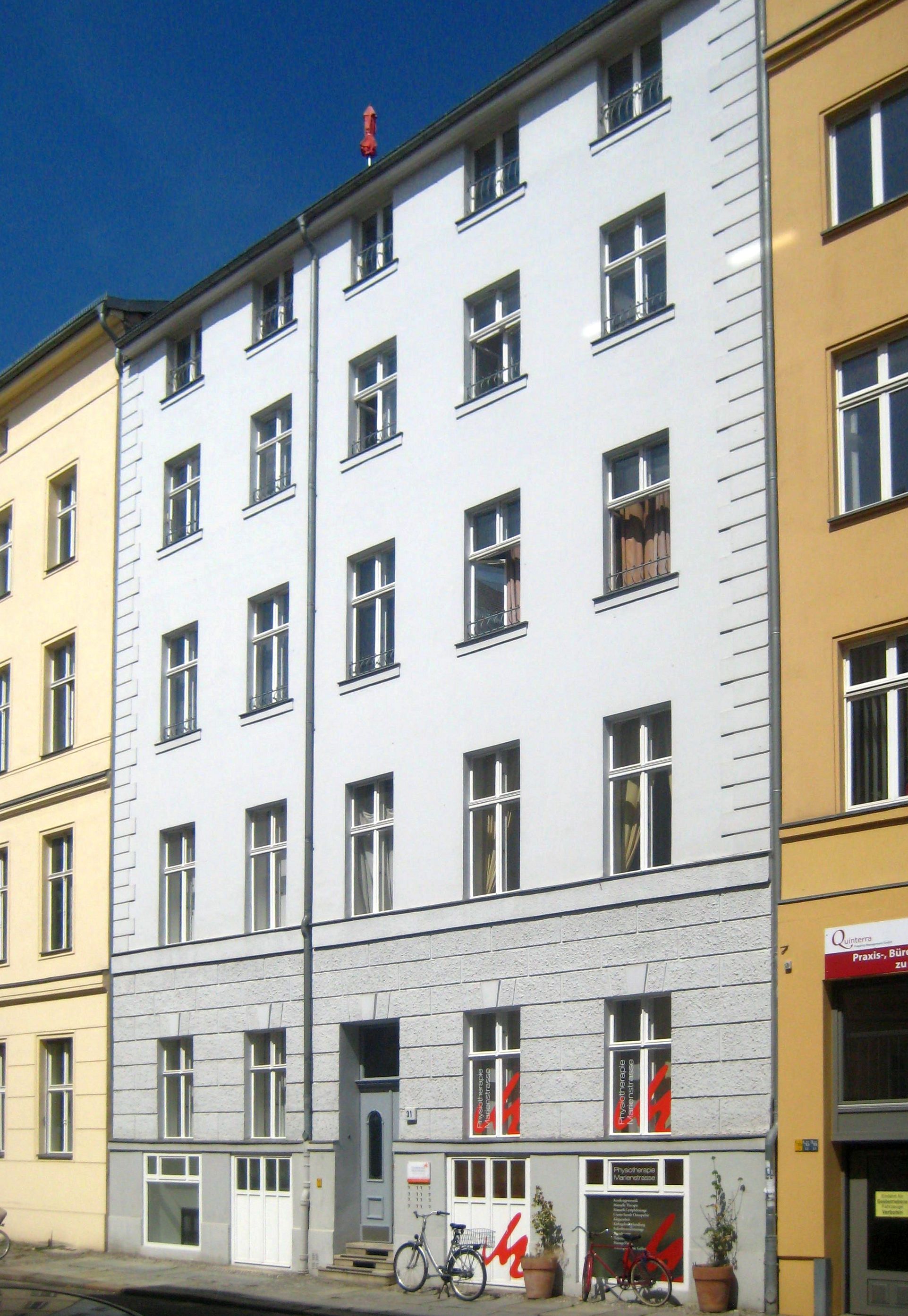 Thomas Nagel blickt vor einem Kaffee sitzend von der Bäckerei auf die gegenüberliegende Haustür.
