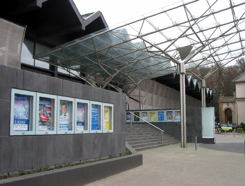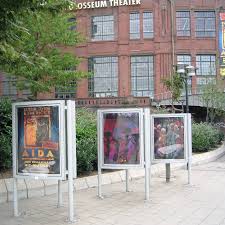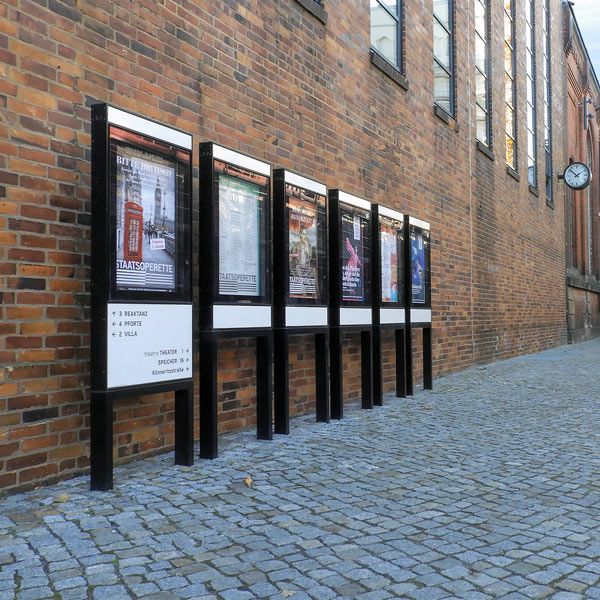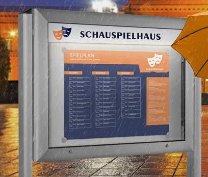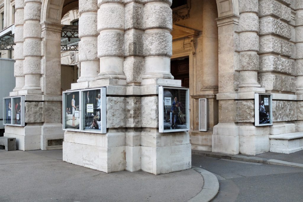 Die Frau geht an mehren Schaukästen vorbei, bleibt an einem stehen und betrachtet intensiv ein Bild.